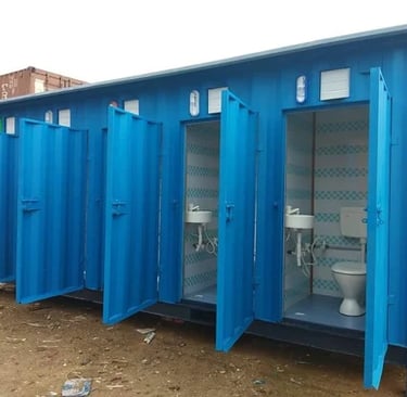Multi-cubicle toilet blocks inside 20/40 ft shipping containers with separate male/female sections, urinals, washbasins, lighting, ventilation and optional solar power. For highways, infrastructure projects and large events.
