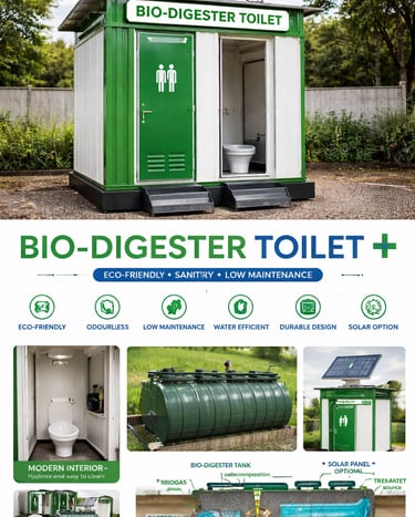 Integrated bio-digester tank using bacterial consortium to convert waste into odourless water and biogas. No sewage line required. Works in all climates. 90% solid waste reduction. Ideal for remote sites and rural projects.