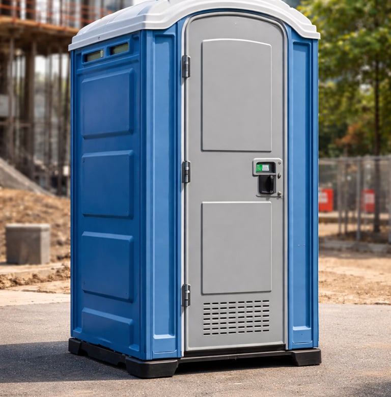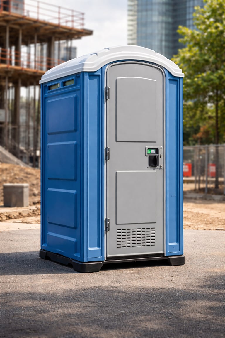 HDPE cabin with Indian/Western seat, ventilation, door latch and 250–500 litre holding tank. Includes automatic hand sanitizer dispenser, odour-control system and non-slip flooring. Ideal for construction sites and events.